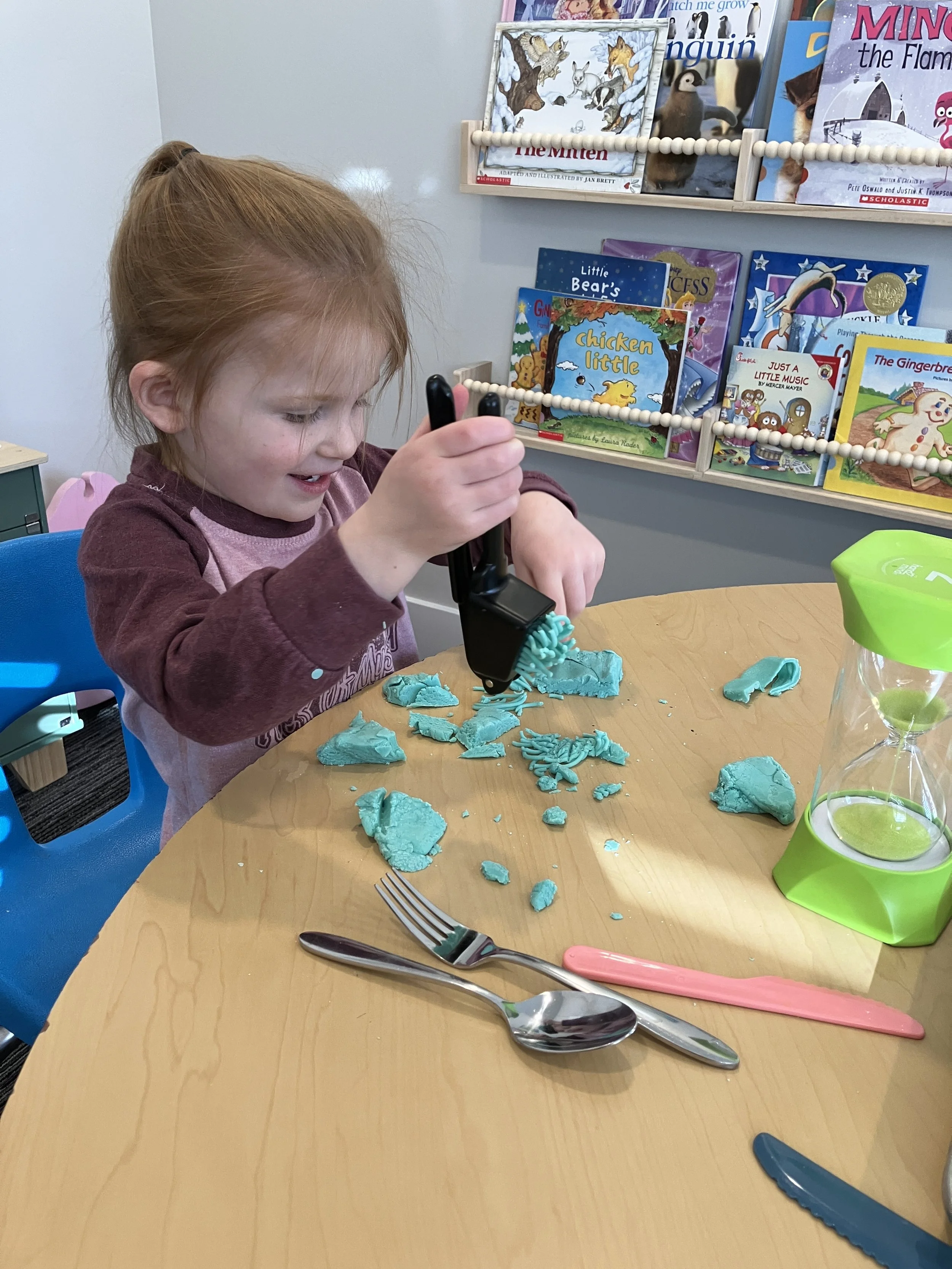 Real rolling pins, cupcake pans, cookie sheets, and eating utensils are great examples of kitchen tools that work well with Playdough. This week, I even tried giving my students a garlic press to make “noodles” with. Not only did they love it, but it also was a great tool to help develop grip strength in their little fingers, which will lead to improved fine motor skills such as handwriting.